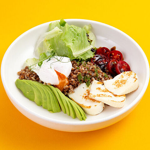 Состав: Гречка отварная, соус песто, яйцо пашот, жаренный белый сыр, авокадо, салат с томатами черри.