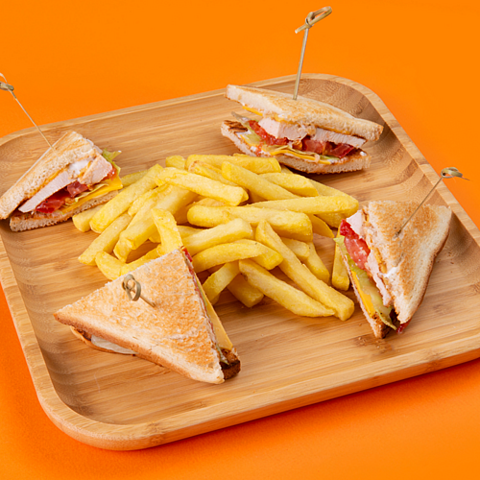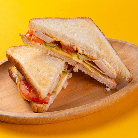 Классический сэндвич из вкусных хлебушков с добротной сочной начинкой из курицы, зелени, томатов, сыра чеддер и сливочного соуса.