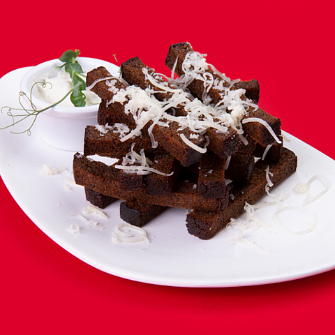 Ароматный бородинский хлеб, обжаренный во фритюре, подается с сырным соусом Блю-Чиз