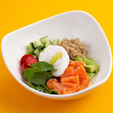 Нежная красная рыба, яйцо пашот, киноа, свежие огурцы и томаты черри, авокадо и листья шпината. Этот боул — не просто еда, а вдохновение, которое наполняет энергией и радостью.