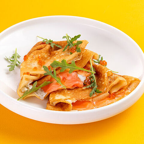 Блины с нежным творожным сыром, филе лосося, икрой. Попробуйте на завтрак под утренний кофе.