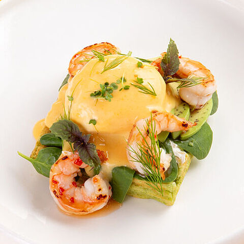 Погрузитесь в мир гастрономического наслаждения с венской вафлей со шпинатом, на вершине которой изящно расположено яйцо пашот и нежные креветки, словно морские жемчужины. Позвольте себе насладиться этим изысканным блюдом, которое пробуждает самые яркие эмоции и аппетит.