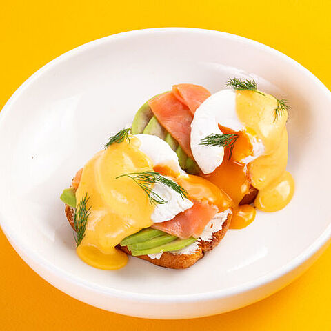 Погрузитесь в утреннюю атмосферу вкусов с яйцом "бенедикт" на нежной подложке свеже приготовленного хлеба бриош, мягкого крем сыра, спелого авокадо и нежного лосося. Позвольте себе насладиться мгновением, когда простое утреннее блюдо превращается в гастрономический праздник.
